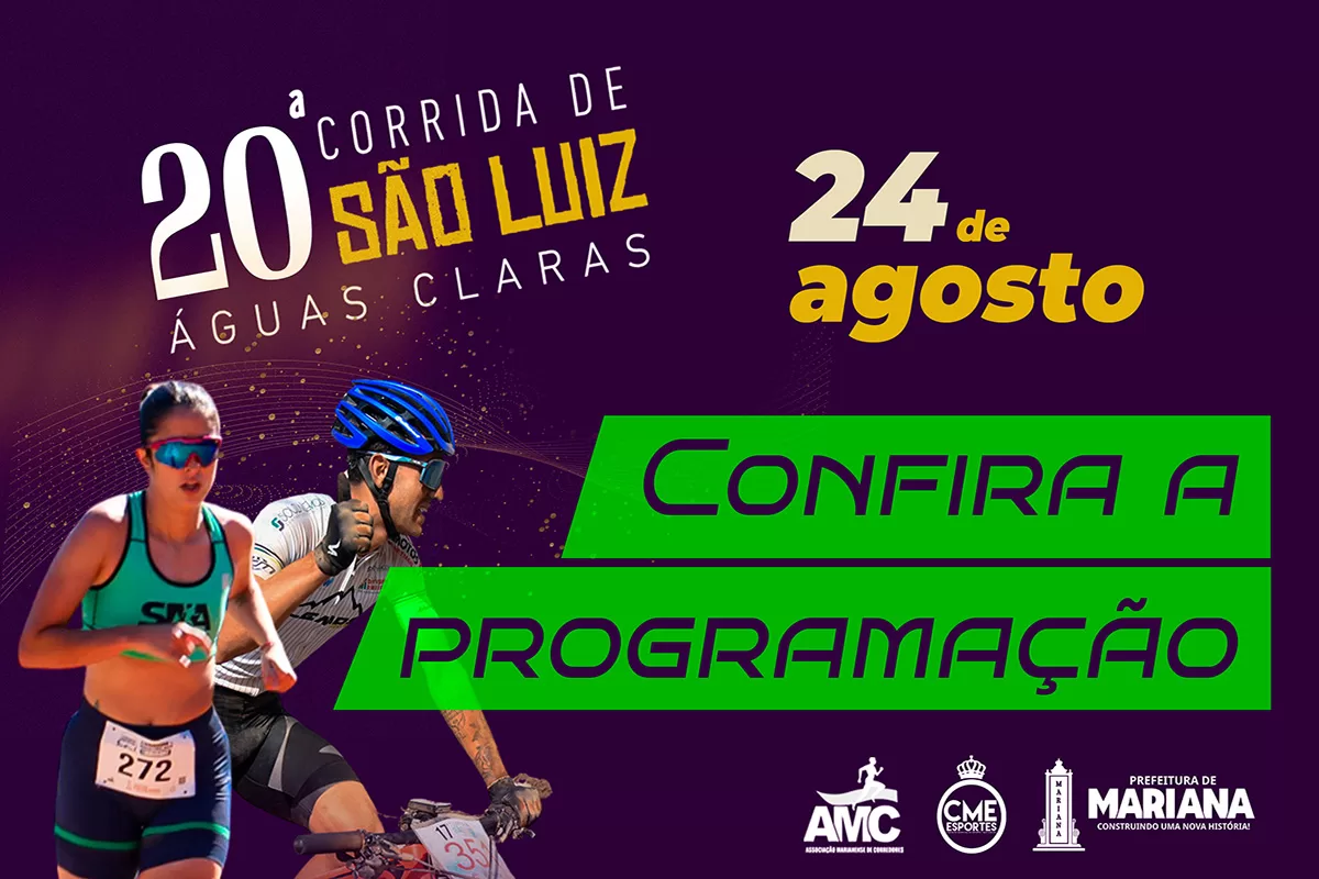 No próximo domingo, dia 24, a Prefeitura Municipal de Mariana, por meio da Secretaria de Esportes, Comunicação e Eventos, promoverá a tão aguardada 20ª edição da Corrida de São Luiz.