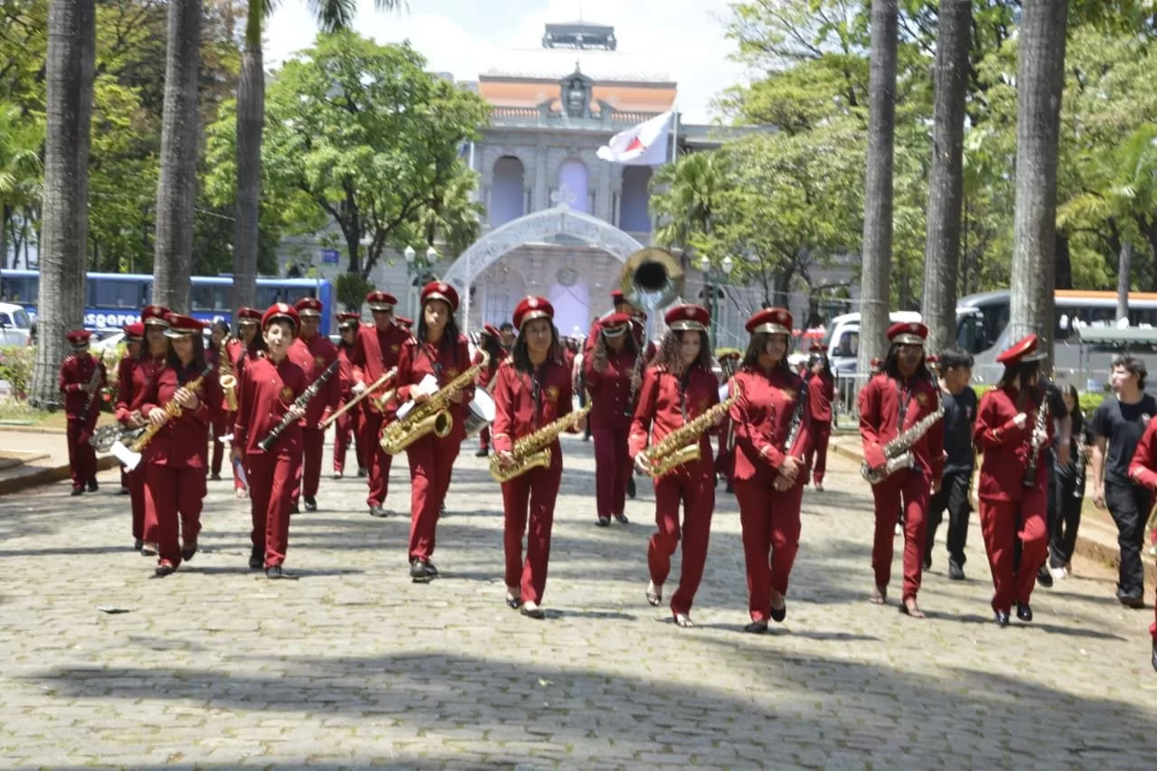 A comemoração seguiu com as bandas em cortejo, partindo do coreto da Praça até o Palácio da Liberdade.
